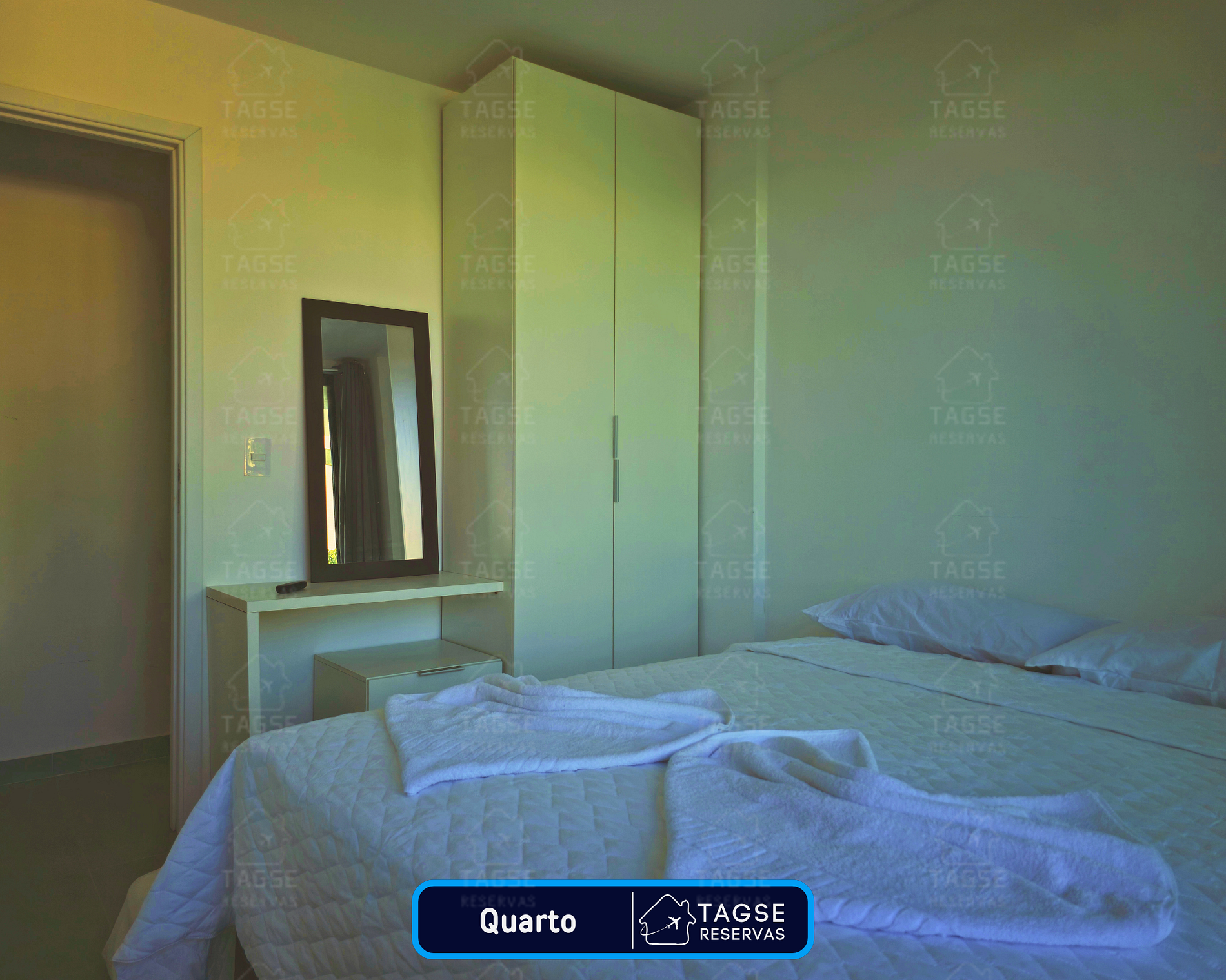 Dois quartos, sendo uma suíte, estão preparados com camas de casal, ar condicionado split (12.000 btus), blackout em todas as janelas, acomodando até 6 hóspedes em um ambiente de alto padrão de qualidade, limpeza e higienização.